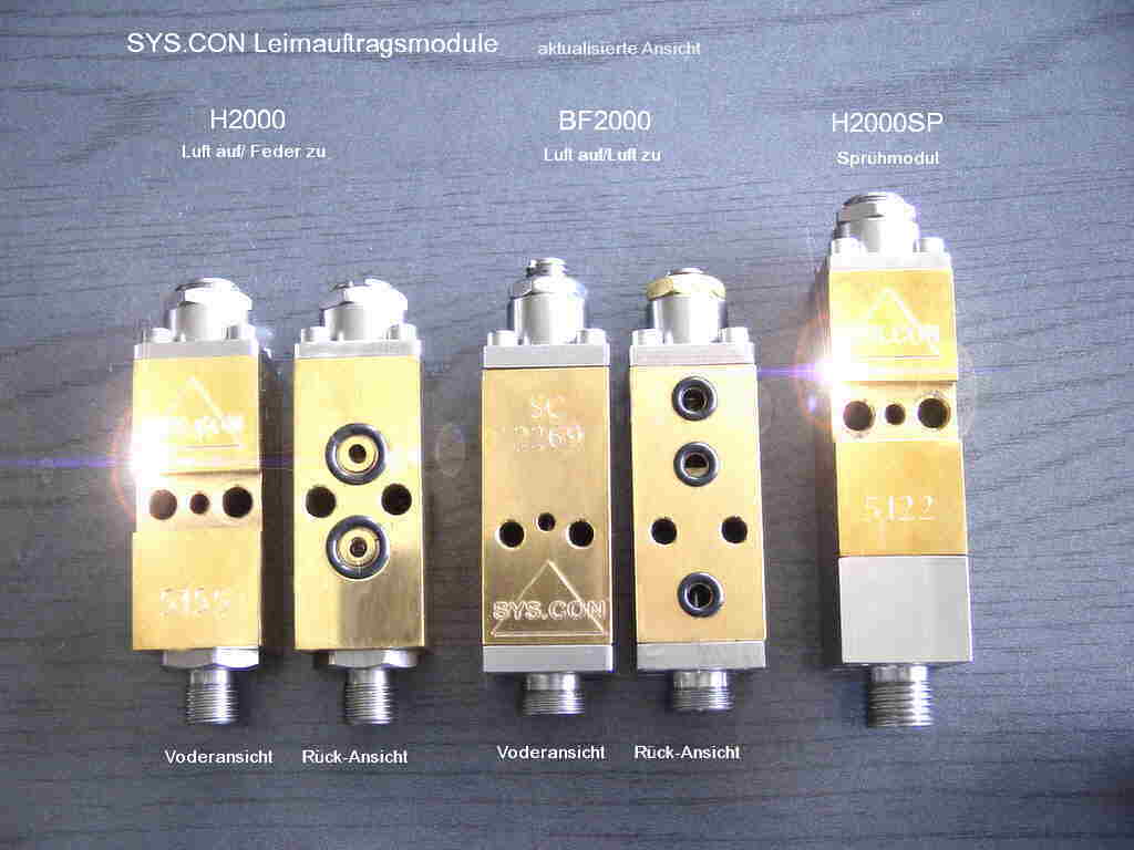 Latest hot melt technology from Germany. All mounting and supply borings are compatible to Nordson® H200/H400, TenPlus®, UES® H100 and H300. The module geometry corresponds to Nordson® H200/H400. The module body is made of brass. Needle and seat are made of stainless steel 1.4305. A long service life is achieved by the sealing packing of superior quality between hot melt and air area that can do completely without any mechanical fixing parts within the area due to its construction. In this way the hot melt can flow troublefree and will not stick to obstacles like springs or similar parts and incrust. The Viton o-ring used in the air area of the piston disk has a far higher service life than normal disk sealings. A setscrew adjusts the spring stroke that can be reduced to zero.